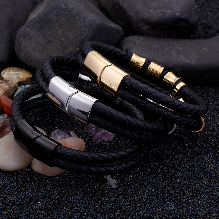 Gold Color Stainless Steel Leather Bracelet Men Black Mens Leather Wrap Bracelets Jewelry Wristband With Magnet Clasp