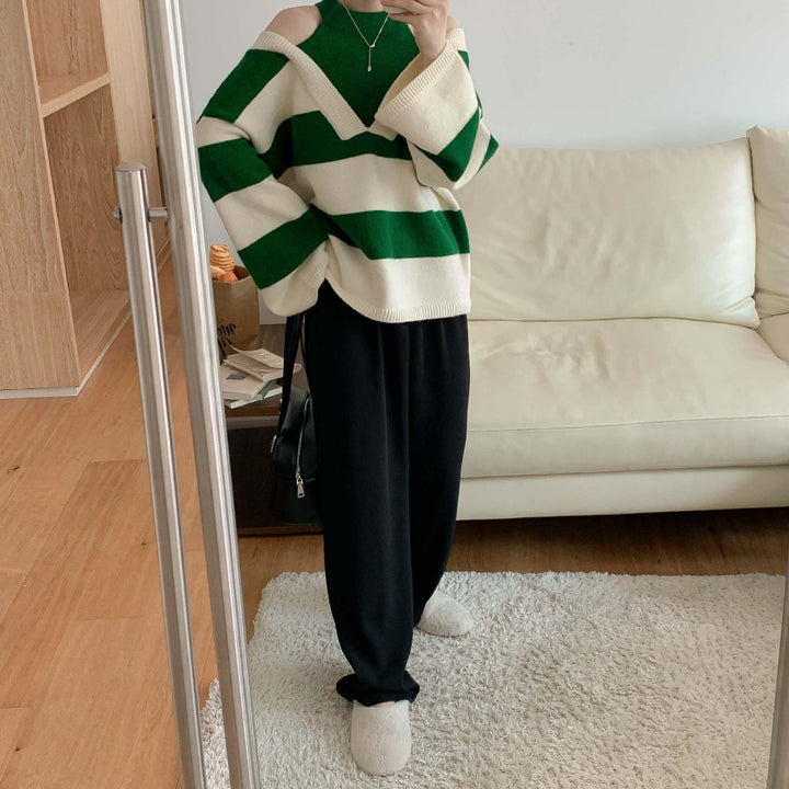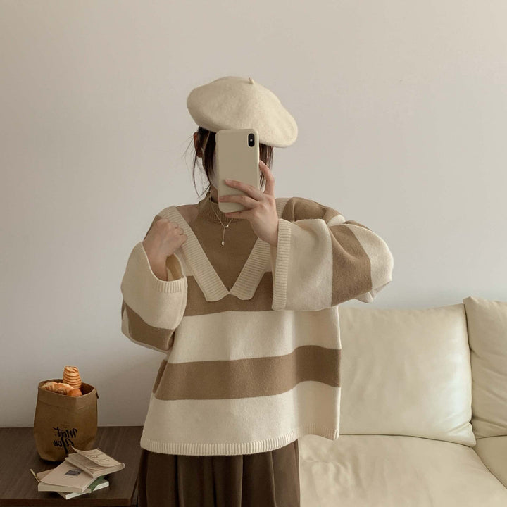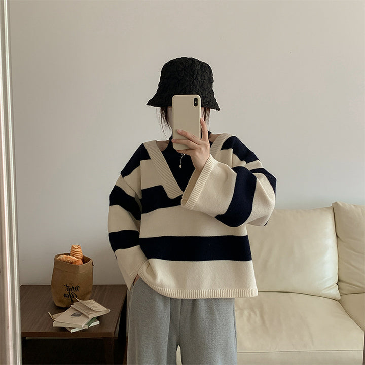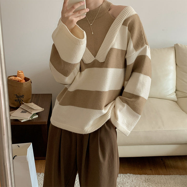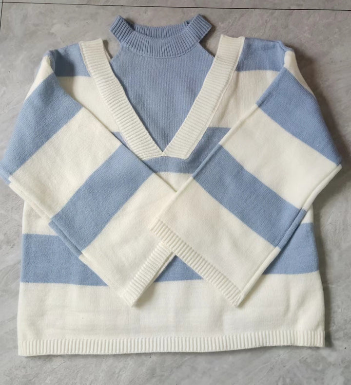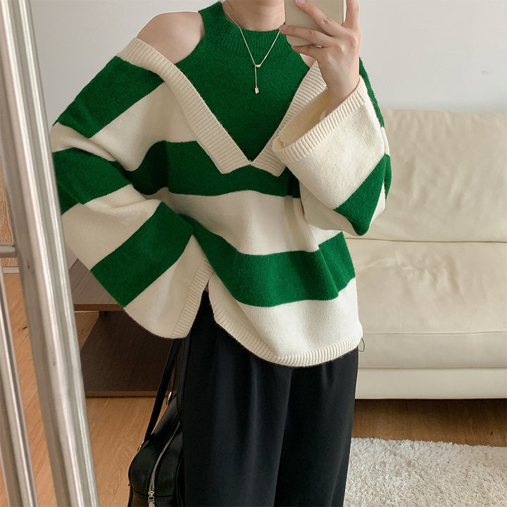 Korean Style False Two-piece Halter Off-the-shoulder Loose Striped Sweater