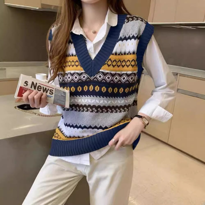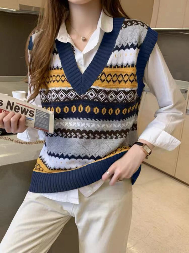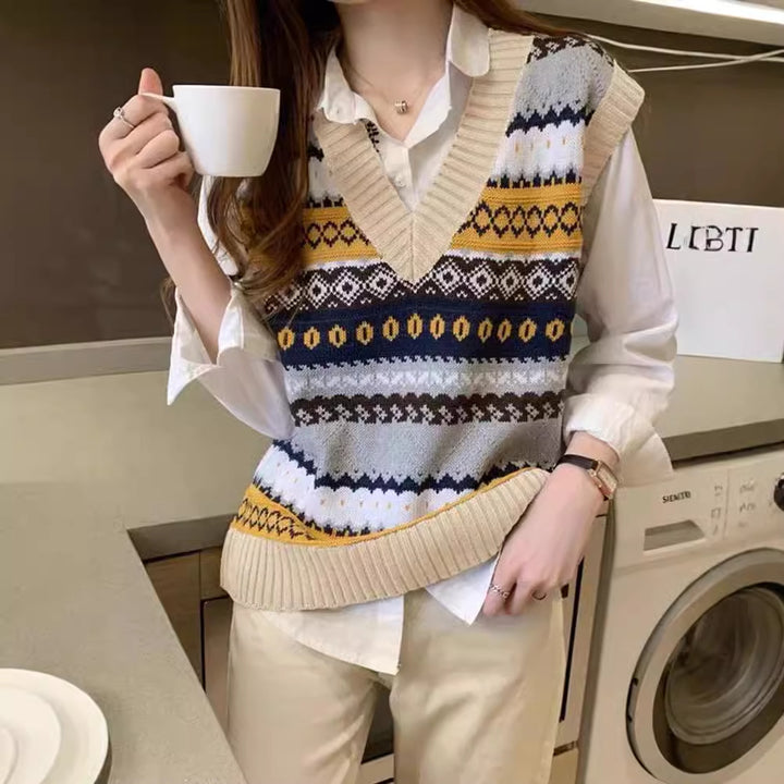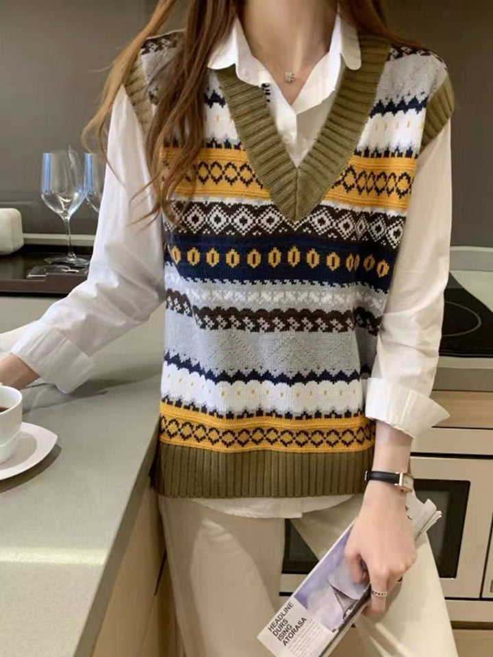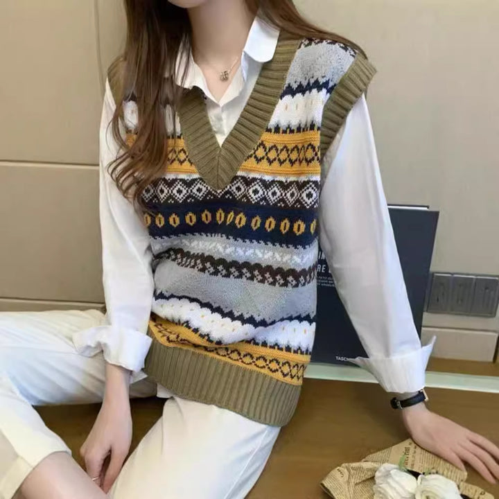 Retro V-neck Rhombus Vest Women's Knitted Jacquard Sleeveless Sweater