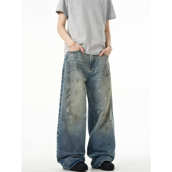 Splash-ink Jeans Men's Retro Washed Distressed Baggy Straight Trousers
