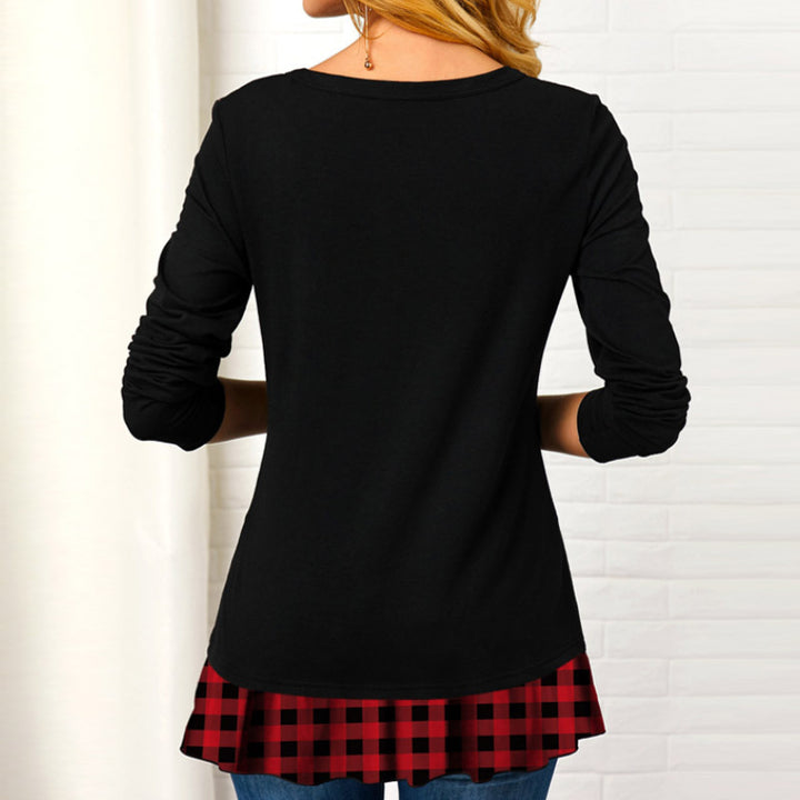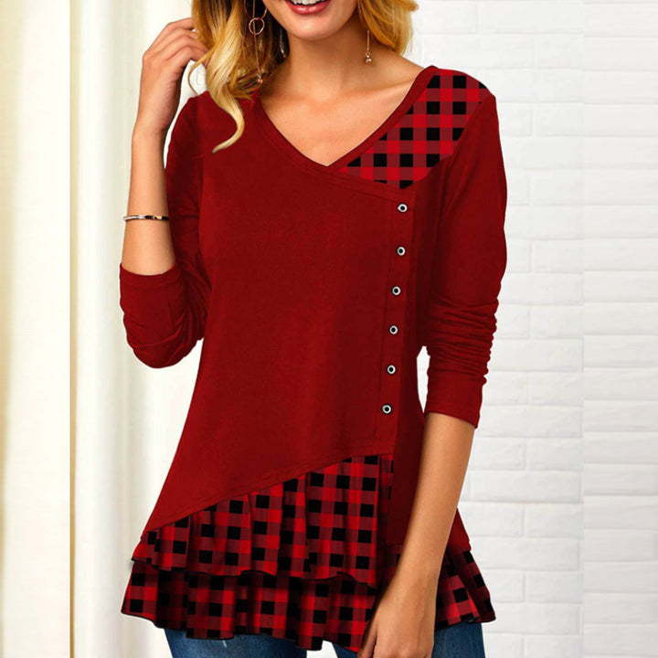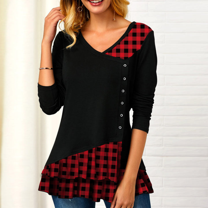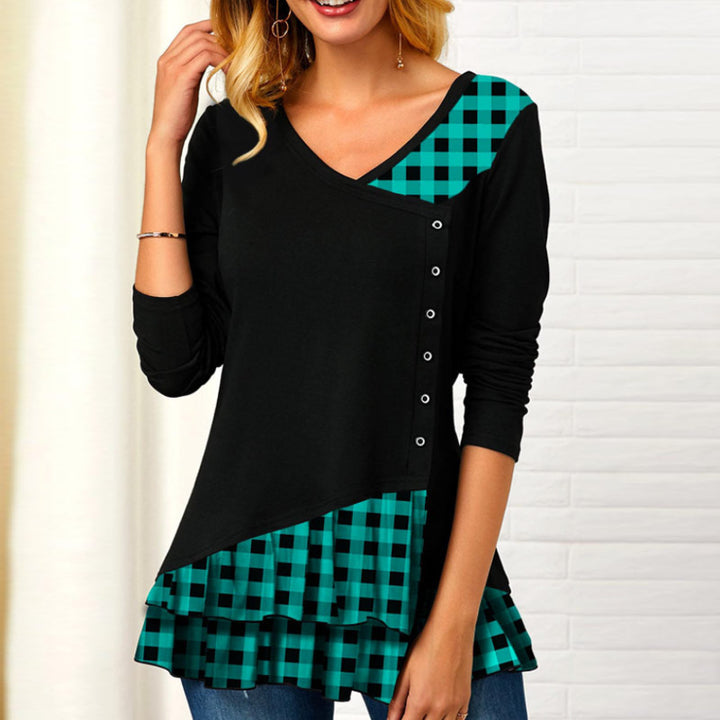 Women's new long-sleeved plaid irregular stitching T-shirts