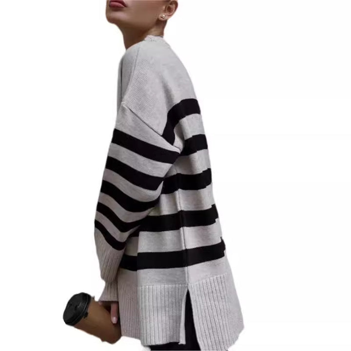 Women's Pullover Loose Round Neck Contrast Color Knitted Striped Sweater